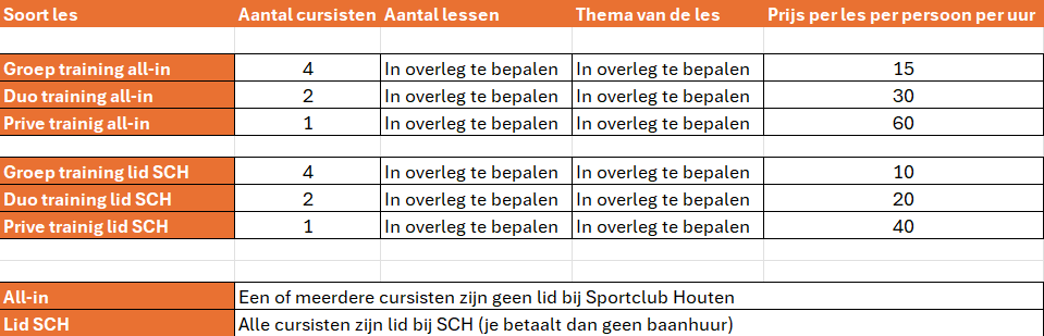 Lesgroepen kunnen bestaan uit 1, 2, 3 of 4 personen. Je stelt zelf je groep samen, zodat je met vaste trainingspartners kunt werken aan specifieke onderdelen van je spel.